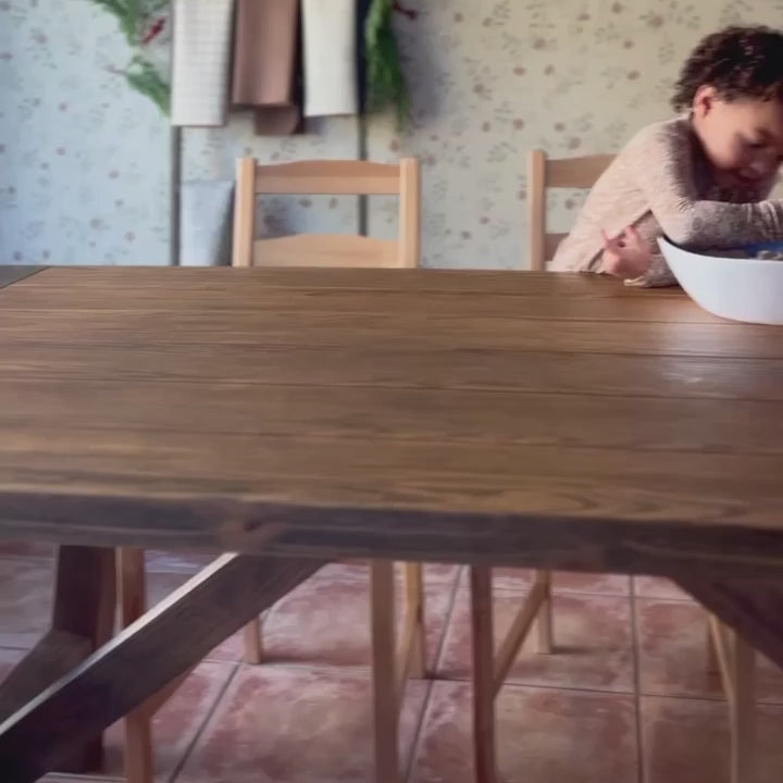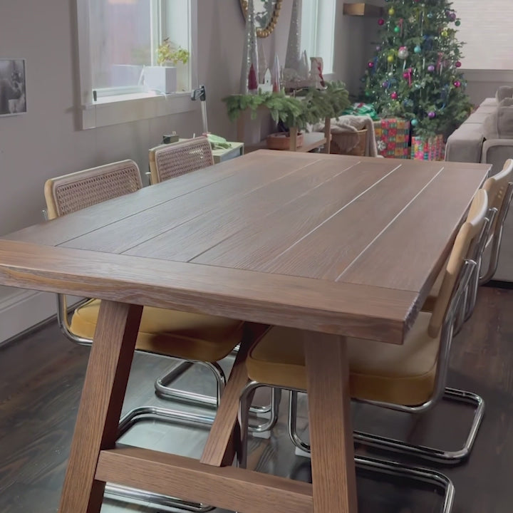 This 100% solid wood dining table is the culmination of years of honing the craft of furniture manufacturing and design. It combines innovative techniques like a customizable base platform and wood embossing technology to create a one-of-a-kind product. Choose your own combination of top and base colors, all with beautiful oak embossed finishes.