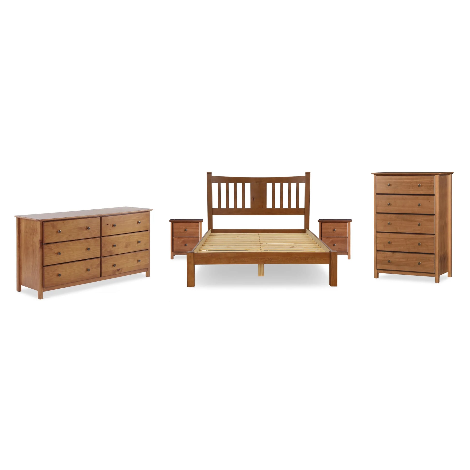 - Set includes 1 bed, 2 matching nightstands, 1 dresser, and 1 chest.
